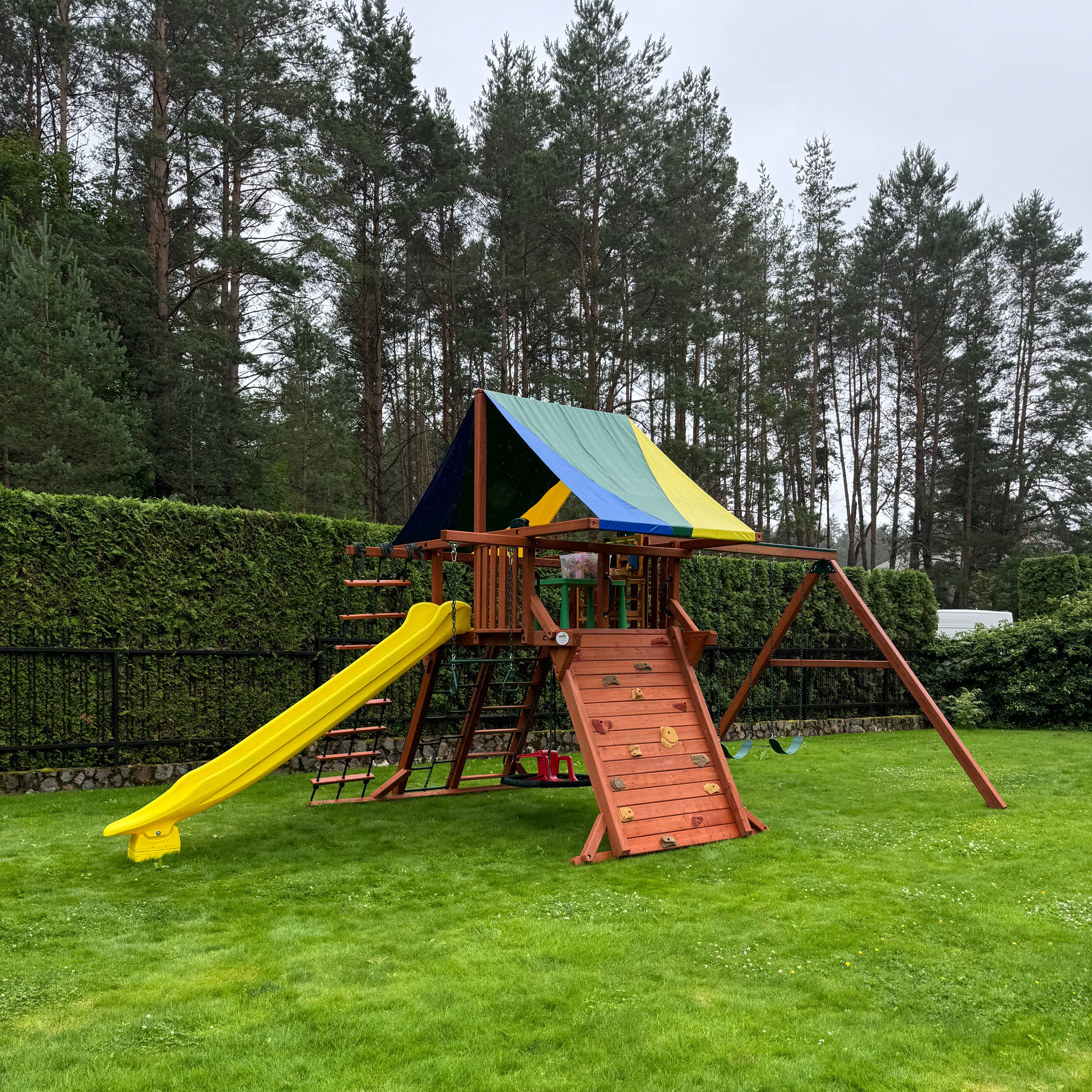 Komplektą sudaro patvaraus brėzento stogas, laipiojimo siena, grandinių kopėtėlės, besisukančios padangos sūpynės, virvinės kopėtėlės, trapecija, tvirtas 2,7 m sūpynių strypas su trimis juostinėmis sūpynėmis ir itin ilga 3,6 m raketinė čiuožykla.